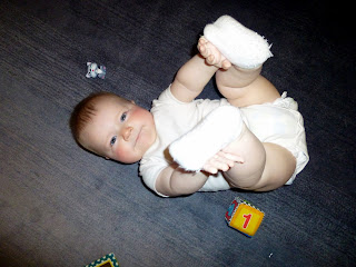 Some things about Henry at this age: He loves having his clothes taken off, it makes him giggle. He hates putting clothes on. He babbles lots and two weeks ago he said "maaaaaa" in reference to me. I'm calling it his first word. He's working on sitting up and if he didn't spit up everytime he leaned forward too much, he would be farther along. He eats one meal each evening around dinner (so far avocados, sweet potatoes, rice cereal and green beans. I'm homemaking all of his food this time. Woot!